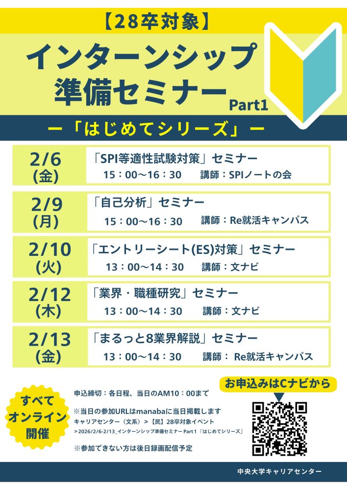 キャリアセンター(文系)>【民】28卒対象イベント>2026/2/6-2/13_インターンシップ準備セミナー Part1「はじめてシリーズ」