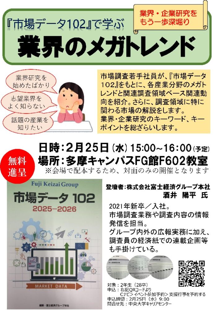 「『市場データ102』で学ぶ業界のメガトレンド」を開催いたします。業界研究を始めたばかりの方に、ぜひご参加いただきたい内容となっております。