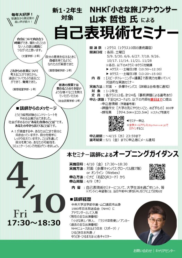 今後の学生生活をより充実させたい方、ぜひお気軽にご参加ください。▼「NHK『小さな旅』アナウンサー 山本 哲也 氏 によるオープニングガイダンス
