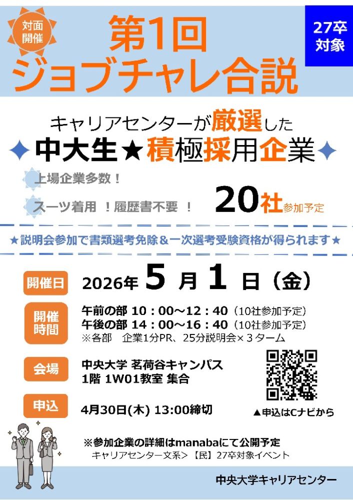 27卒者向けの合同企業説明会「第1回ジョブチャレ合説」を茗荷谷キャンパスで対面にて開催します。