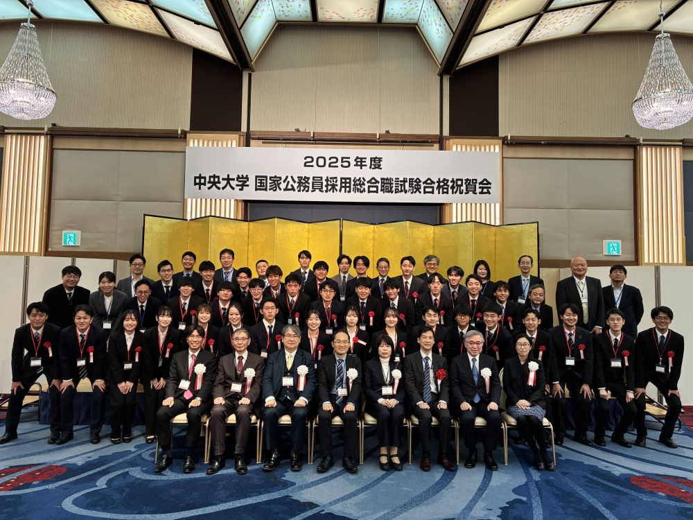 中央大学より2025年度国家公務員採用総合職試験(春試験)に58名と2024年度国家公務員採用総合職試験教養区分(秋試験)に12名が合格し、合格祝賀会を11月8日に東京ガーデンパレス「高千穂」にて開催いたしました。