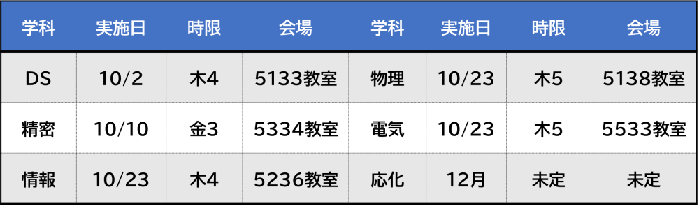 - 2025年10月2日(木):DS4限、10日(金):精密3限、23日(木):情報4限、物理・電気5限