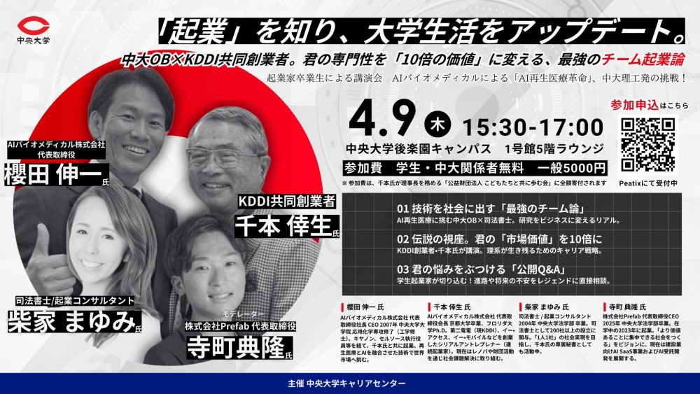 中央大学卒業生起業家が語るキャリア論-学生起業、スタートアップ、M&Aー多様なキャリアのリアルから、“自分らしい未来”を考える講演会第2弾です。