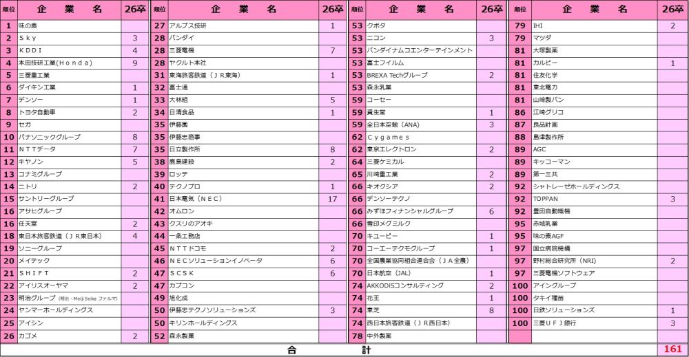 現就活生(27卒生)が選ぶ「就職企業人気ランキング」が4月15日に発表となり、この春(2026年3月)卒業・修了した、本学理工学部・研究科生161名が、「理系学生が選ぶ上位100社」に就職していることが、4月28日付のキャリアセンターの調査でわかりましたので、お知らせします!