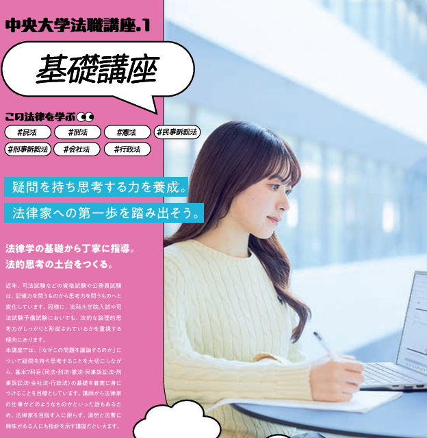 これから本格的に司法試験合格のための勉強を始めたいと考えている皆さんはもちろん、公務員試験を目指している皆さんや、もう一度、基本科 目を基礎から学び直してみたいと考えている皆さんも、是非、この基礎講座を受講して、それぞれの目標に向けた最初のステップを力強く踏み出し てください。