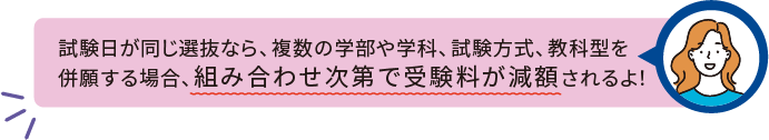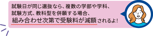 ●複数の学部を併願する場合、2つ目以降の出願は入学検定料を減額し、1出願につき15,000円になります(▶詳しくはCheck04)。