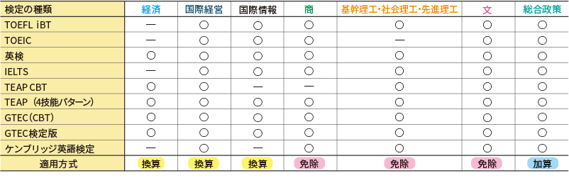 学部が指定した英語資格・検定試験の級・スコアを、一般方式の英語の科目免除や得点換算・加算に活用できます(▶詳しくはCheck04)。