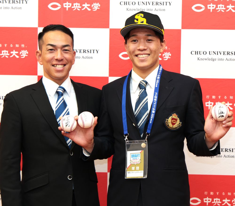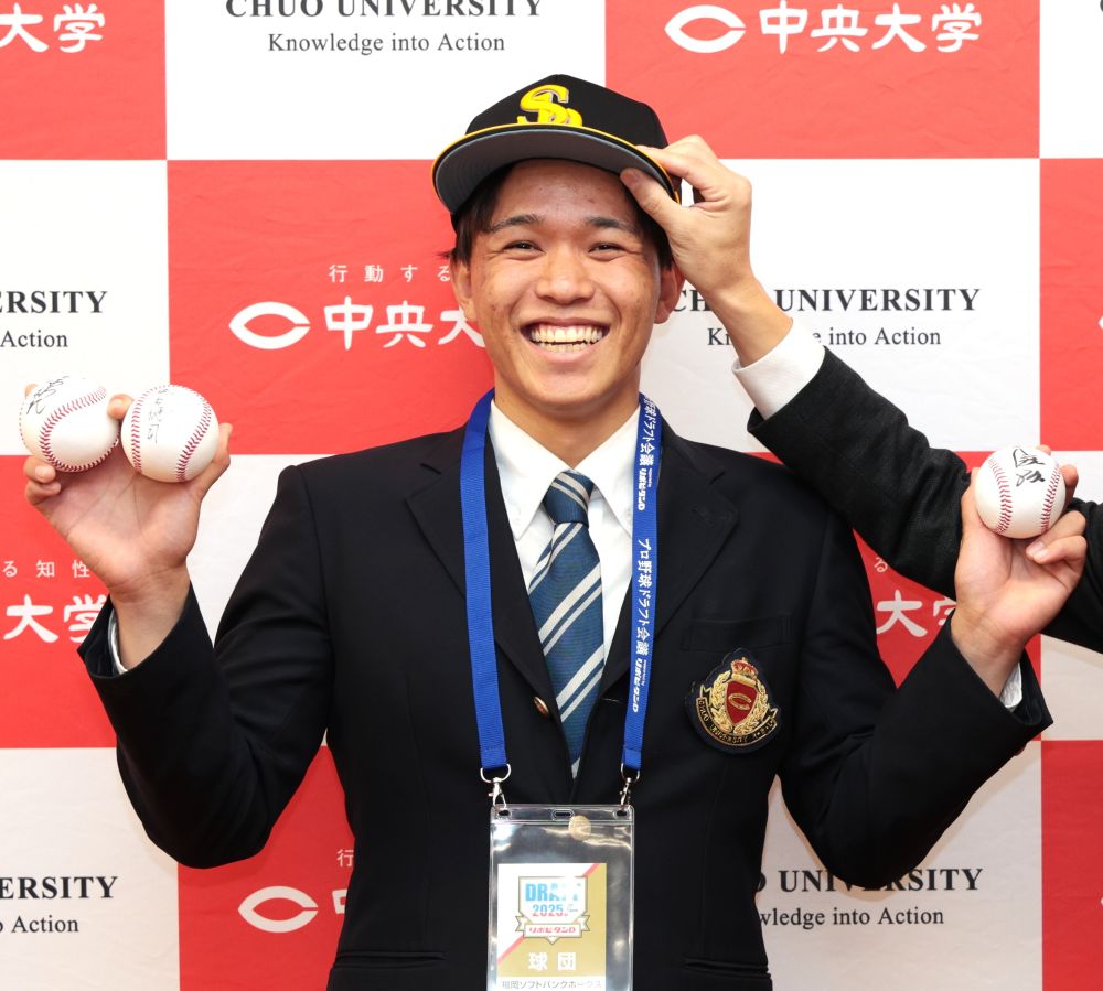 準硬式野球部の大山北斗投手(商4)が、2025年10月23日のプロ野球ドラフト会議で、福岡ソフトバンクホークスから8位(育成枠)で指名された。ドラフト指名選手の誕生は中大準硬式野球部史上で初めて。大山投手は同29日に多摩キャンパスで記者会見し、「準硬式野球の選手たちの目標の存在となるよう、後輩に夢と希望を与えられる選手になりたい」と抱負を語った。