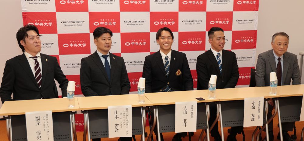 記者会見する大山北斗投手(中央)と福岡ソフトバンク、中大準硬式野球部の関係者
