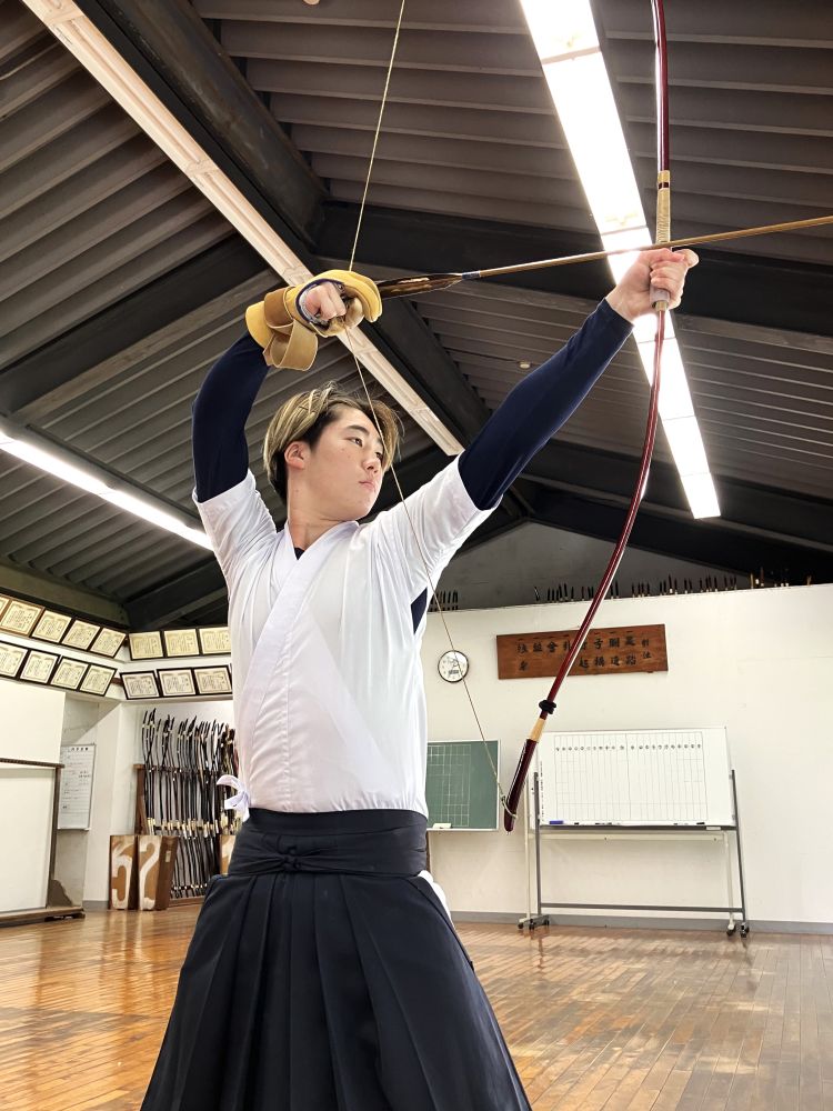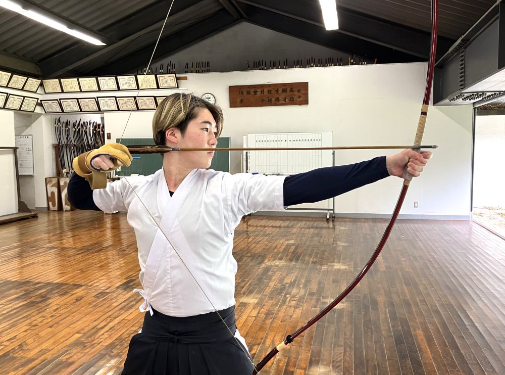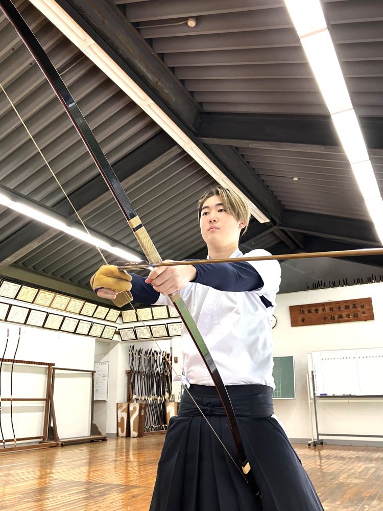 自身の弓道の特長は、弓手(ゆんで=左手)にあると考えている。矢を放つ瞬間、弓手がぶれずにしっかりと安定している状態。それを常に意識して練習に臨んでいる。射型は、力んで腕の力だけで弓を引いてしまうのを避け、「肩と胸を開き、骨盤を立てる意識で体で引く」のが理想だ。「弓を引く筋肉は、練習で弓を引かないと身につかない」と語る。