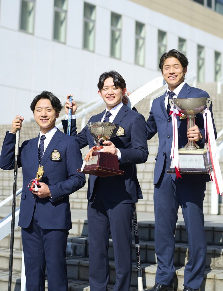 大会ベスト6に選出されたFWの荒木零士選手(総合政策4)、ゴールキーパー(GK)の川合温大(はると)選手(文4)を含む卒業生3人に、連覇の喜びと、仲間への思い、アイスホッケーに打ち込んだ4年間の学生生活で学んだことなどを尋ねた。