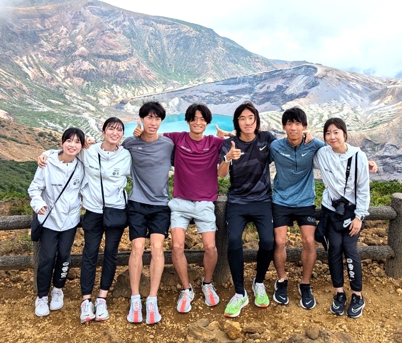 山形の蔵王合宿時、4年生で記念撮影。(左から)マネジャーの今村美唯菜さんと米山結夏さん、佐藤宏亮選手、伊東夢翔選手、吉中祐太選手、