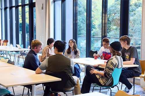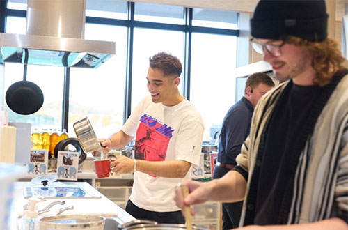 キッチンに併設されたラウンジでは、一緒に調理した食事を楽しむ場となっているほか、勉強したりおしゃべりしたり、寮生が自由に過ごせる空間となっています。