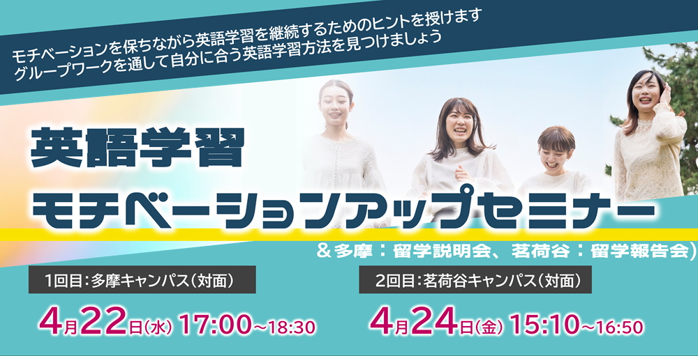 英語を学習しているけれど、なかなか成果が感じられない、学習が継続できない、学習のコツが分からないという中大生のみなさんに向けた、英語学習モチベーションアップセミナーを開催いたします。