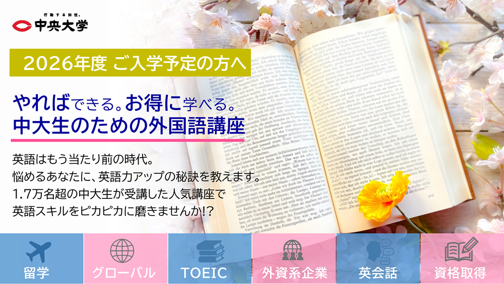 本学では、グローバル人材の育成がますます重要視される中、2012年より外国語講座を開講し、中大生のみなさんの語学力向上と海外留学を支援してきました。これまでの受講者は延べ1.7万名を超え、クオリティに優れた課外講座として、非常に満足度の高い人気講座となっています。