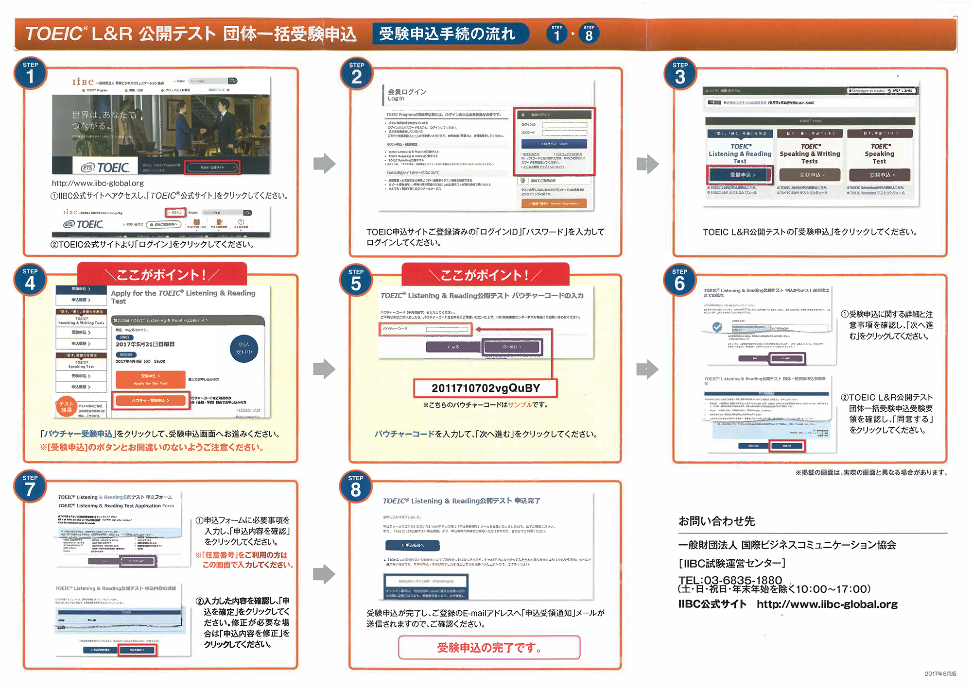 バウチャーコードを購入しただけではTOEIC L&R 公開テスト受験申込は完了しておりません。TOEIC申込サイトにて各自受験申込手続きを行ってください。