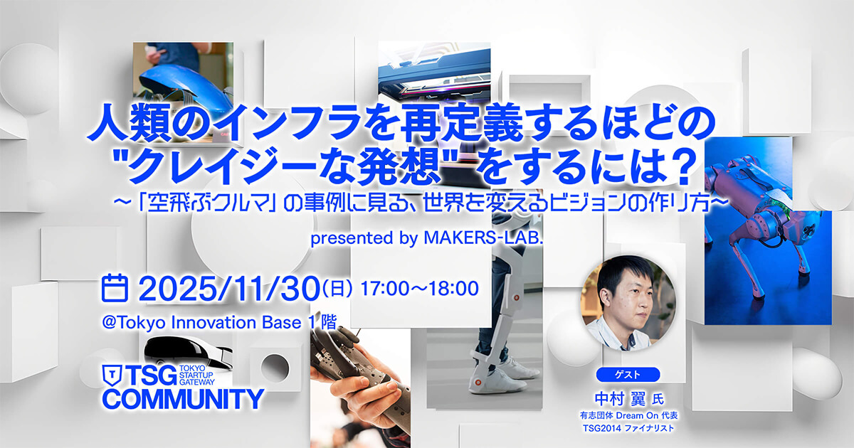 TOKYO STARTUP GATEWAYコミュニティ(TSGコミュニティ)は、2014年から東京都主催で毎年開催されているスタートアップビジネスコンテスト「TOKYO STARTUP GATEWAY」が運営するコミュニティです。単発イベント・連続プログラム・テーマ型ラボなど、多様なスタイルでの学びと実践の場を提供しています。