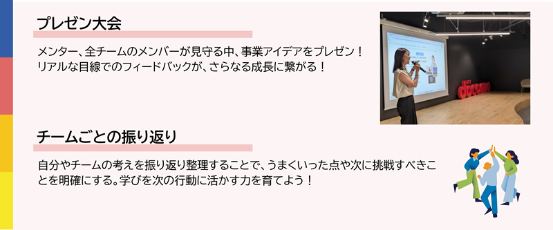 - 私はこれまでビジネスは一人で進めるものだと思っていましたが、今日チームで取り組んでみて、みんなで話し合うことでたくさんの意見が出て、本格的なビジネスプランにつながるんだと実感しました。また、プロの方に頼ったり、相談したりすることの大切さにも気づくことができました。