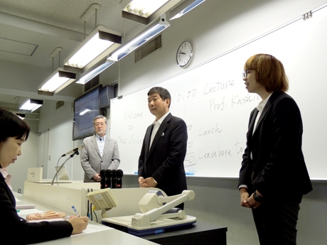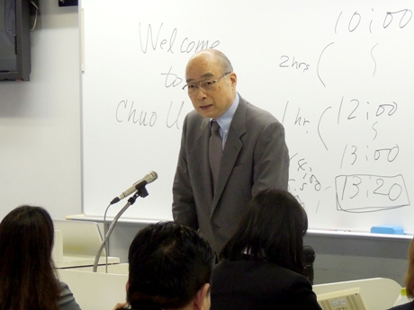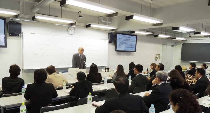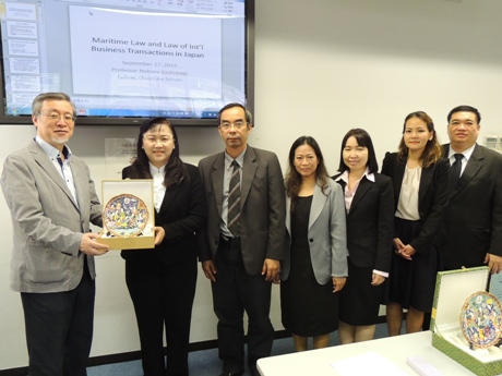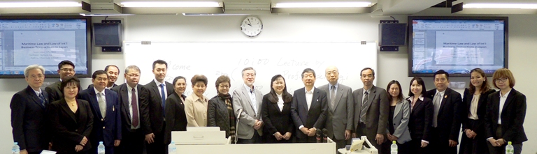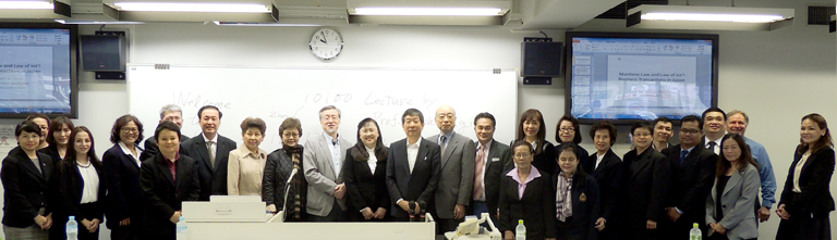当日は藤原靜雄法務研究科長、大村雅彦法務研究科教授・常任理事が一行を出迎え、その後、柏木 昇前中央大学法務研究科教授が講演を実施。講演は「Maritime Law and Law of international Business Transactions in Japan」をテーマに、明治時代に近代化を急いだ日本の法律の歴史や、日本における海事法と国際商取引について解説されました。一行はこの後、大村教授と共に霞が関の知的財産高等裁判所を見学し、翌日は横浜の港湾施設などを視察しました。