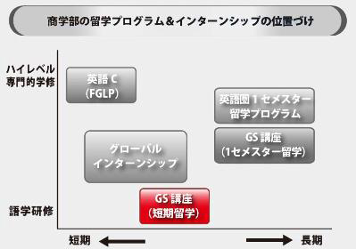 留学のための学習環境整備として、交換・認定留学までを視野に入れた準備指導を行う科目です。商学部生なら誰でもGS講座(講義)を受講でき、単位を取得することによって留学に参加する資格が得られます。
