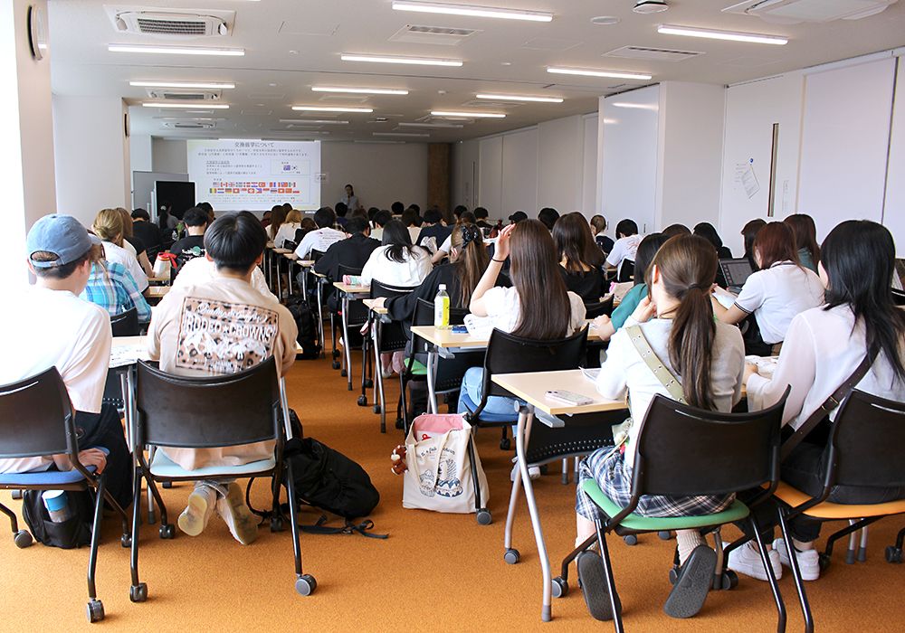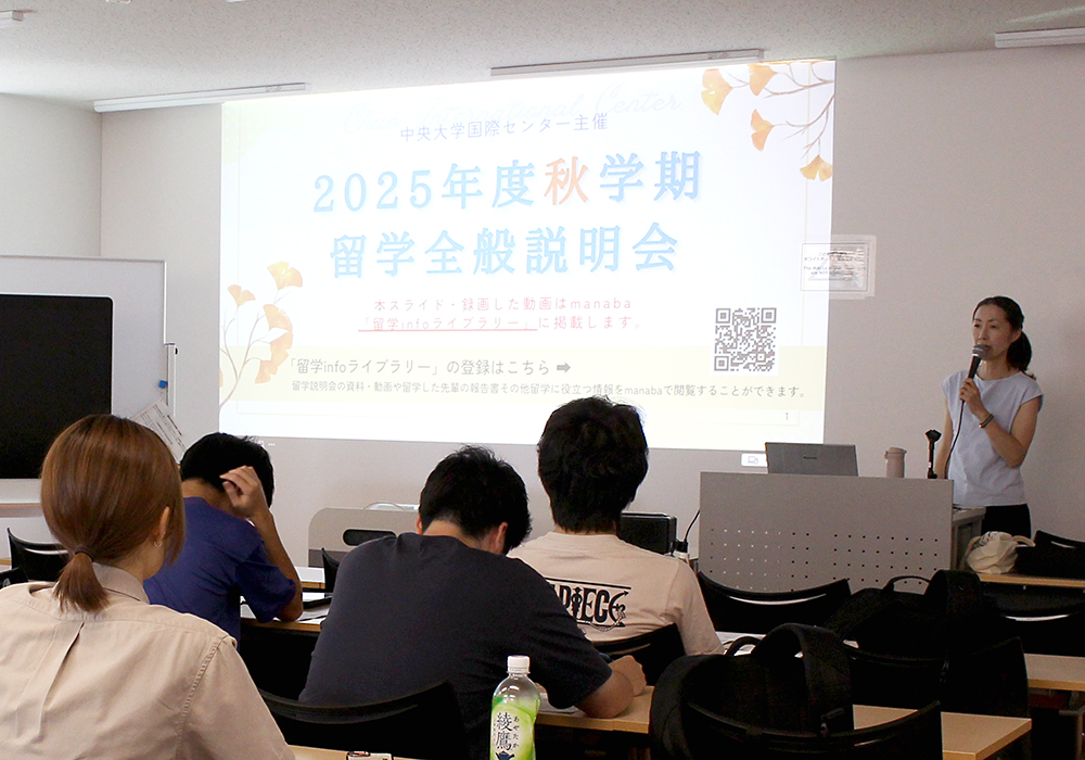 初日の企画として、多摩キャンパス フォレスト館の教室にて実施された「2025年度秋学期 留学全般説明会」には、1~2年生を中心に60名以上が参加しました。お昼休みの短い時間にもかかわらず、多くの学生が熱心に耳を傾け、留学に対する関心の高さが感じられました。