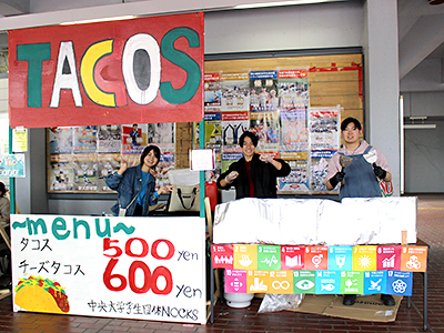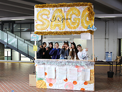 学生主体で国際交流や語学学習を推進するキャンパス内のグローバル拠点「Gスクエア」は、タピオカやナタデココ、フルーツを合わせたサゴ風ドリンクを用意しました。また、フェアトレードの普及を目指す学生団体「FACT」は、国際協力につながるフェアトレードドライカレーナンを提供。国際経営学部の学生や海外からの留学生向けに交流イベントを企画・運営する学生団体「G-ACE」は、タコスミートとチーズをのせたホットドッグを販売しました。