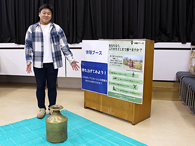 林ゼミナールとユニセフによる共同企画「出張ユニセフハウス」では、貧困や紛争などにより世界の子どもたちが直面する課題をパネルで紹介。子ども兵や水の衛生の問題など、厳しい現状を伝えました。 さらに「地雷」「蚊帳」「水運び」の体験コーナーも設けられ、来場者は実際に触れたりスタッフと対話しながら、子どもたちの置かれた環境やユニセフの支援活動への理解を深めました。