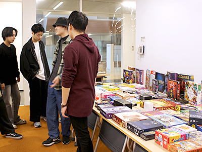 学生国際交流委員会・英語学会は最新のVR機器を使った「VR世界旅行」体験を実施し、リアルなバーチャル海外体験が注目を集めました。ゲームボードサークルJACKPOTによる「ゲームボード交流会」では、ドイツを中心に発展した多種多様なボードゲームを紹介し、初心者もルールの説明を受けながら、その場で対戦を楽しむ姿が見られました。史学研究会の展示「見よ!史学研究会2025」では、ヴェネツィアの統治、三国志、オスマン帝国、ヨーロッパ封建社会など、幅広いテーマの研究成果が公開され、来場者の関心を集めていました。