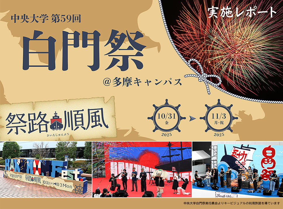 2025年10月31日(金)から11月3日(月)までの4日間、多摩キャンパスにて「第59回白門祭」が開催されました。今年のテーマは“航海”。地図や海をモチーフに彩られたキャンパスには、学生によるステージ発表や企画展、模擬店が並び、多くの来場者でにぎわいました。