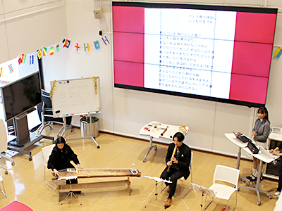 演奏は、尺八・琴・サックスによるアンサンブルからスタート。やさしい音色がGスクエアに響き渡ります。各曲の演奏後には、「ハウルがソフィーと最初に会った場所は?」や「カオナシが千尋をつけ回した理由は?」など、その作品にまつわるクイズが出題され、学生たちは作品の物語やキャラクター思い出しながら、積極的に手を挙げて回答しました。