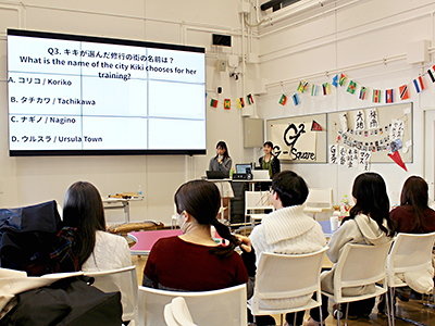 「和と洋の音色で紡ぐ、ジブリ作品の世界へ」をテーマに、スタジオジブリ作品の名曲を、尺八・琴・サックスという和洋の楽器が織りなす音色と、クイズを通して、参加者はジブリの世界観を楽しみました。会場にはお菓子やドリンクも用意され、リラックスした雰囲気の中、学生同士の自然な交流も生まれていました。
