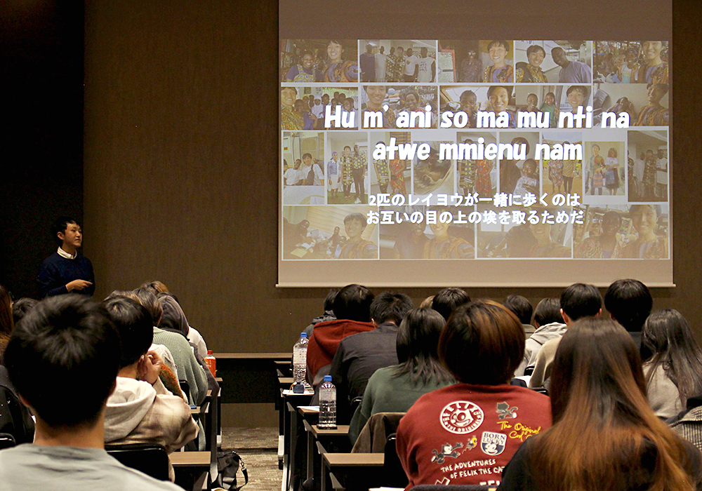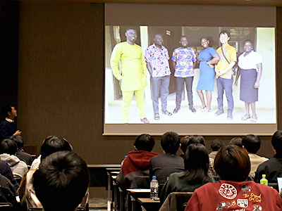 2025年12月9日(火)、多摩キャンパス グローバル館7階のホールにて「JICA海外協力隊セミナー2025」を開催しました。本セミナーは、JICA海外協力隊の活動や国際協力の現場について理解を深めることを目的に、2009年から実施されています。講師には、JICA(独立行政法人 国際協力機構)より内山華世さんと、本学OBでJICA海外協力隊の隊員としてガーナで活動した薮下拓紀さんを講師に迎え、約70名の学生が参加しました。