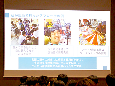 また、薮下さんが現地で実践したアプローチとして、実演による説明やラジオ出演による現地語での情報発信、アートを取り入れたワークショップなどが紹介されました。支援には時間と費用がかかるからこそ、「どこまで寄り添い、どこから現地に委ねるか」というバランスの重要性を強調しました。