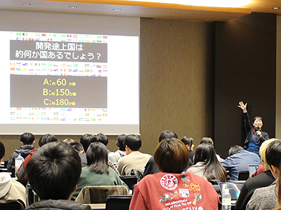 世界には約200か国あり、そのうち約150か国が開発途上国で、世界人口の約80%がそうした国々に暮らしています。内山さんはこの割合を、会場に集まった参加者の人数に置き換えながら説明し、学生が実感をもって理解できるよう工夫しました。