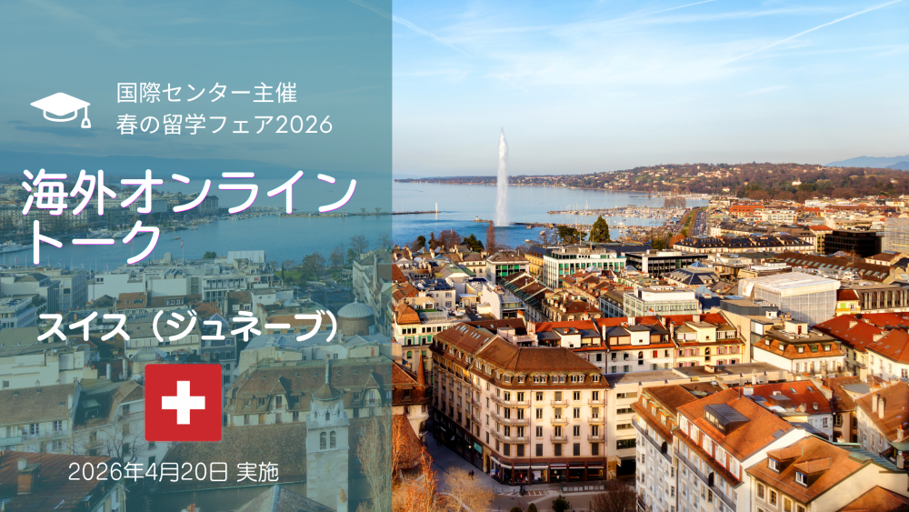 4月20日(月)には現在海外に留学をしている本学の学生に国際交流センターのスタッフがインタビュー形式で話を聞く「海外オンライントーク」が開催されました。今回の登壇者は、スイスのジュネーブ大学に留学中の町田さん(中央大学 総合政策学部所属)です。