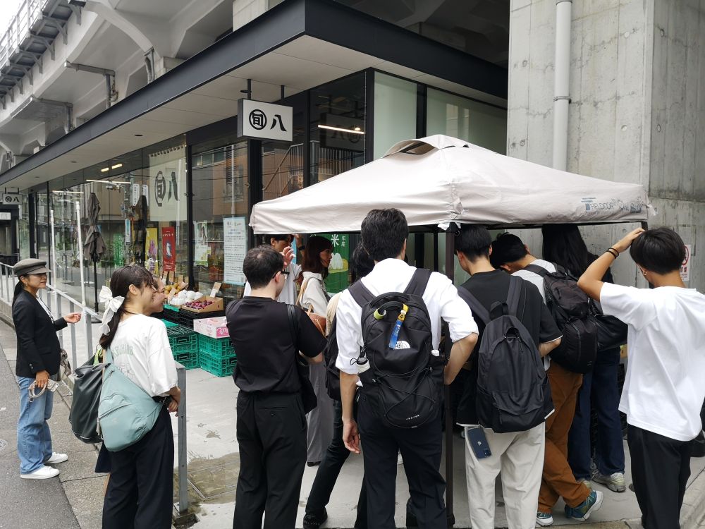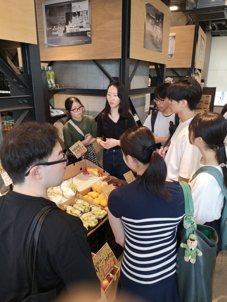 大田市場での見学を終えた後、バスで旬八青果店の店舗がある五反田駅へ。アグリゲートの人事担当の方から、店舗で扱っている商品やお店のコンセプトについて説明を受けました。旬の野菜や果物を中心にこだわりの商品が並ぶ店内に、学生たちは興味津々。「おいしそう!」「お手ごろ!」と言いながら買い物を楽しむ学生の姿も見られました。