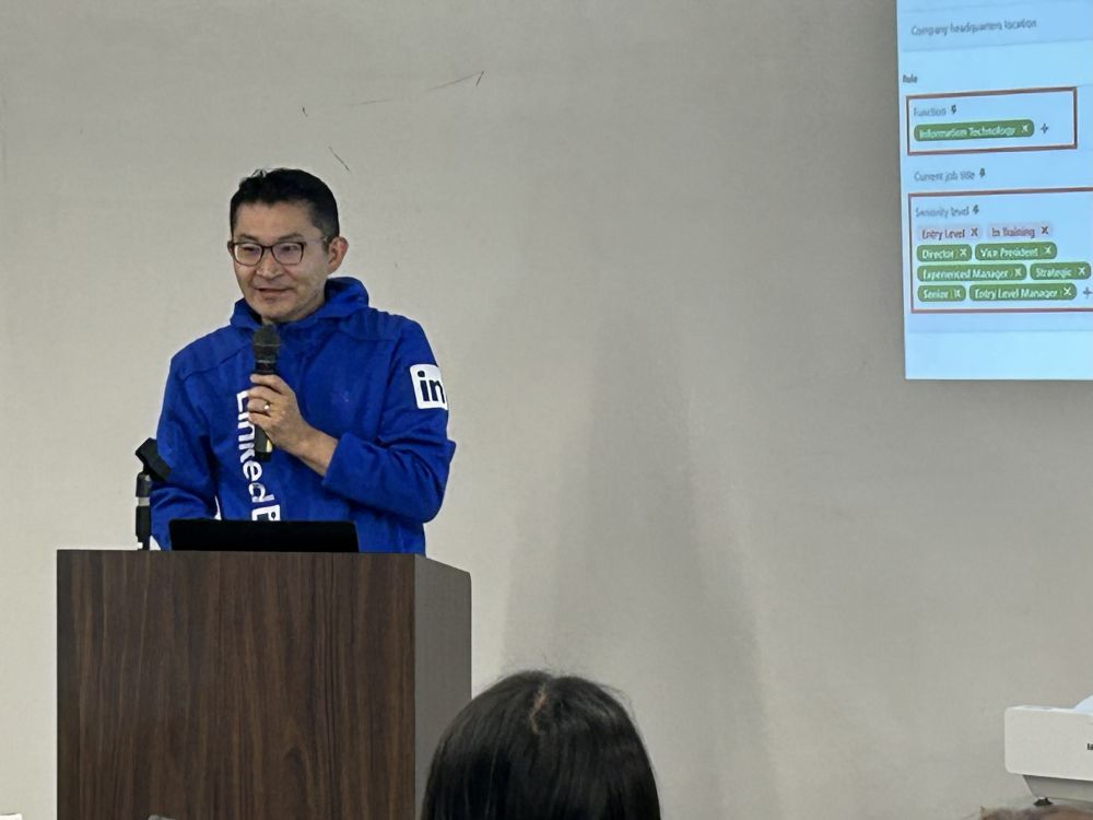 今回の講師は、リンクトイン・ジャパン株式会社 パートナービジネス統括 石坂誠 氏。文系出身からIT業界に飛び込み、グローバルな舞台で活躍を続ける石坂氏が、これまでの挑戦の軌跡とそこから得た学びについて、フレンドリーで親しみやすい語り口で熱く語ってくださいました。未知の分野に飛び込む勇気、そして失敗を恐れずに挑戦し続けることの大切さを、彼自身の経験を交えながら力強く伝えてくださいました。