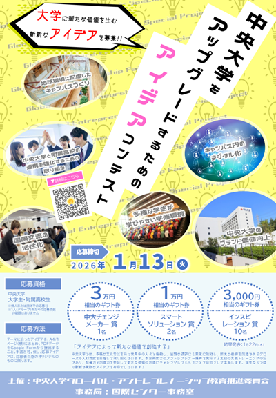 (1)応募期限:2026年1月13日(火) (2)結果発表:2026年1月22日(木) (3)応募資格:中央大学学生(学部・大学院・専門職大学院)、中央大学附属高校生 (4)募集テーマ 1. 国際交流を活性化する方法(国内学生と外国人留学生の交流促進)