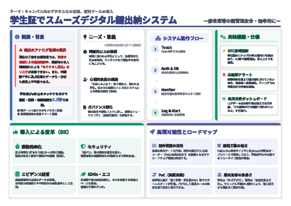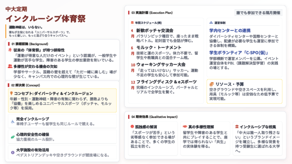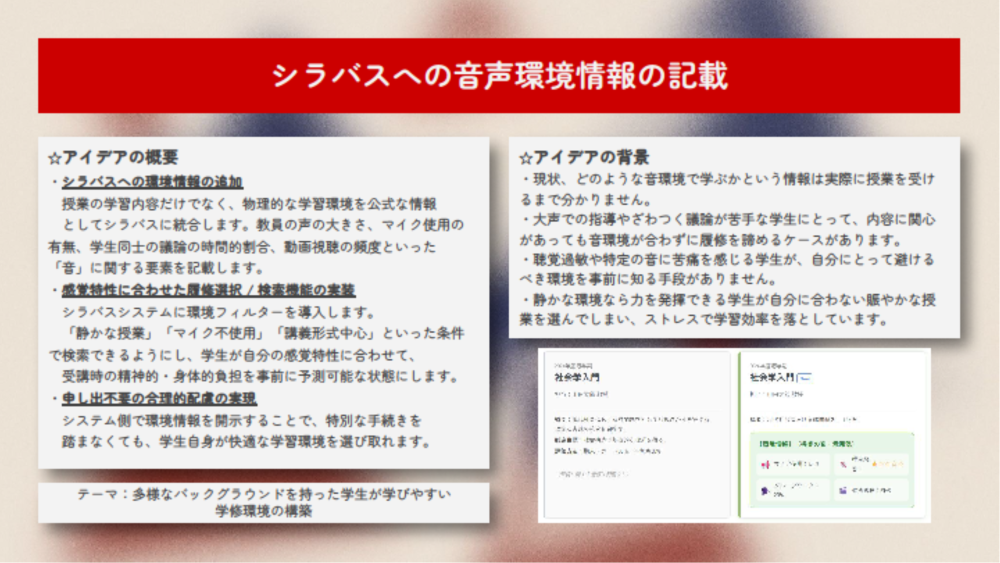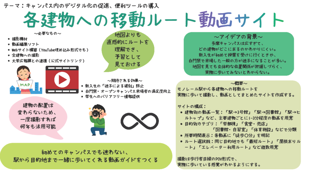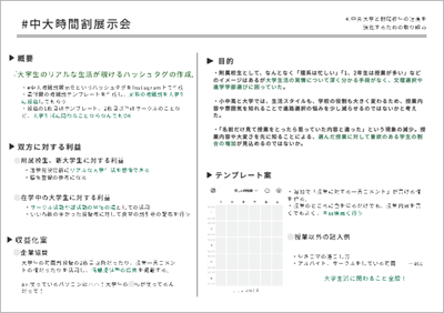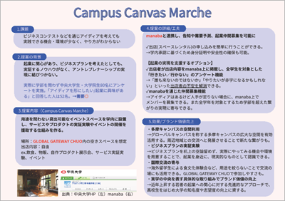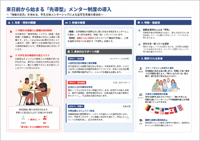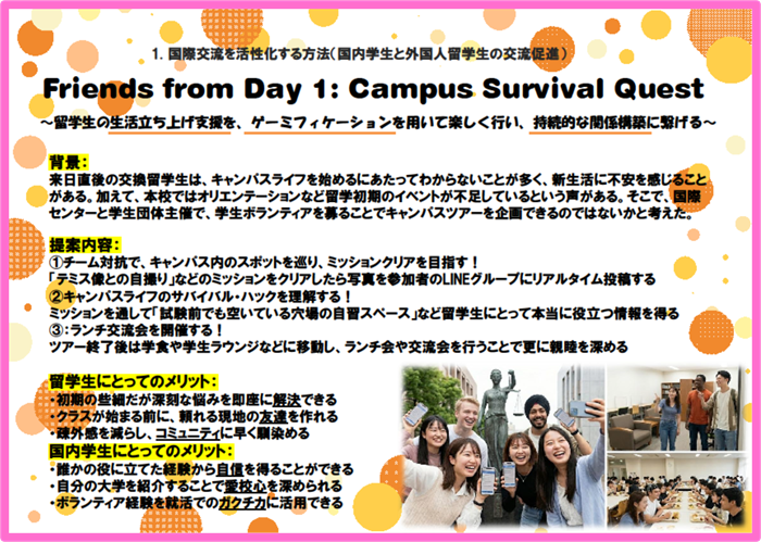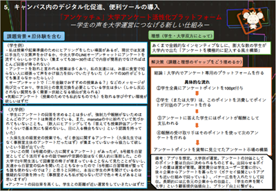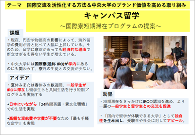 ◆審査員コメント:新生活の不安を解消するためのアイデアであり、お互いに楽しみながら留学生と国内学生の交流を深めることができそうです。実現可能性が高く、それぞれのメリットも整理されており、双方にとって良い効果が期待できる点が高評価に繋がりました。