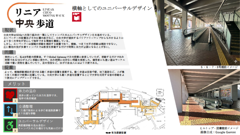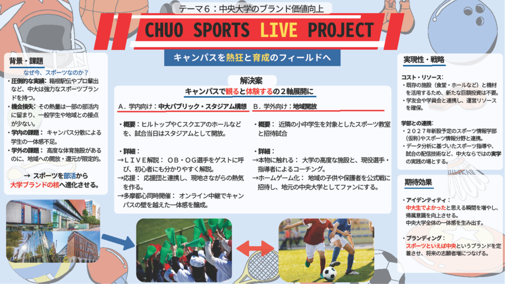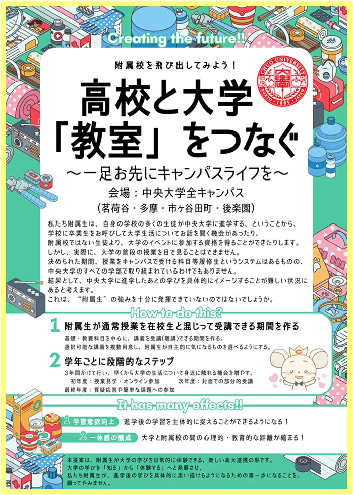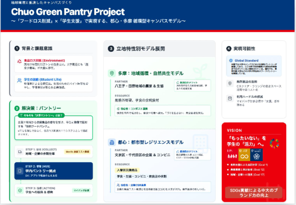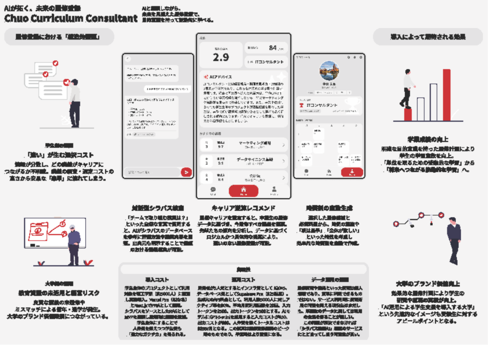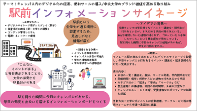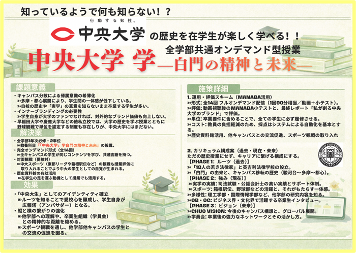 ◆審査員コメント:課題意義から施策詳細まで十分に練られている提案です。とりわけ、「単なる歴史授業とせずキャリアに繋げる構成にする」ことで、学生のみならず学員も含めた「帰属意識」「一体感」も構想に含めた点も素晴らしいです。他大学でもこのような大学を学ぶ講座は公開されていますが、中央大学の歴史と共に愛校精神を醸成するためにの大変良いアイディアだと感じました。