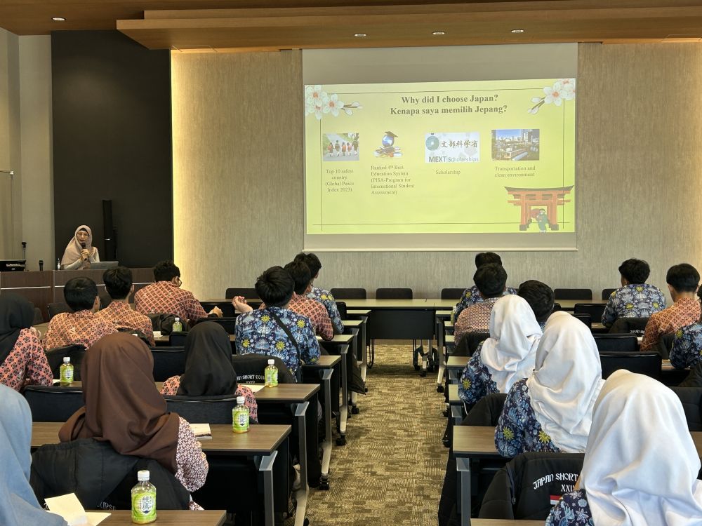 文学部・若林教授からの歓迎メッセージで始まった交流会では、国際センター事務室スタッフによる大学紹介を行ったあと、インドネシア出身の本学学生(理工学研究科)による自身の日本での留学生活について説明をした後、フリートークセッションに入りました。奨学金制度や入試制度、日本での具体的な生活について生徒の皆さんから多くの質問が寄せられ、本学学生の話に耳を傾ける様子が見られました。