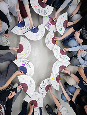 韓国語授業は9時から13時まででした。週に一度は午後に文化授業もあり、K-POPの歌詞を使ったリスニングやイントロクイズ、韓国ドラマでの学習、扇子にハングルを書く活動、韓国の昔遊びなど楽しみながら学べる内容でした。授業では指名されることも多く、集中して授業を受けることができました。