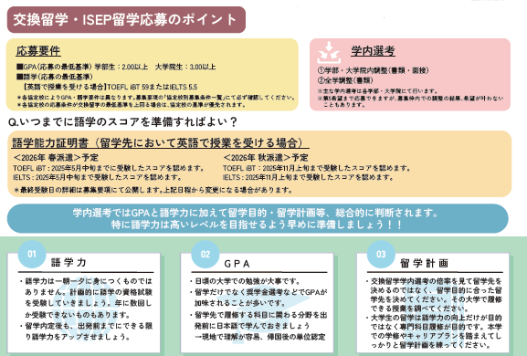 学内選考 | ・有 ・時期【春派遣】留学前年 6月 /【秋派遣】留学前年 12月上旬~1月末 ・ISEPと合わせて第5希望まで志望大学を提出できる |