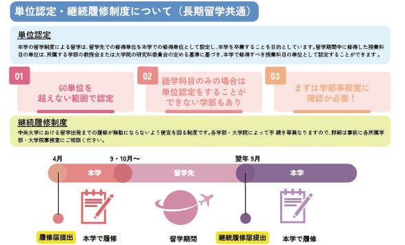 | 概要 | 中央大学の協定校へ留学する制度で、単位取得を目的に主に専門科目を履修する留学です。 留学先国によって派遣時期が異なります。学内募集は、春派遣については留学前年の5月下旬~6月上旬、秋派遣については留学前年の11月に募集され、学内選考があります。 |