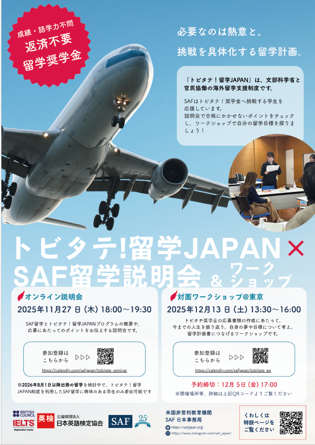 【SAF日本事務局】【SAF日本事務局】26夏・秋出発 留学説明会(12/16)、トビタテ!ワークショップ(12/13)、SAF留学帰国生座談会(1/17)のお知らせ \(^_^)/