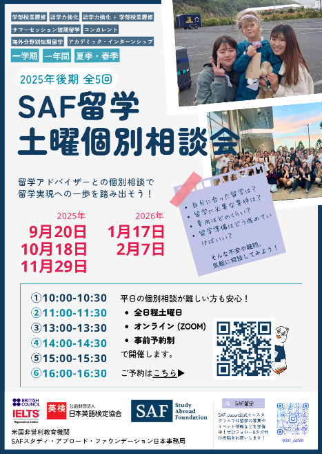 SAF留学 土曜日個別相談会を後期も開催しています!