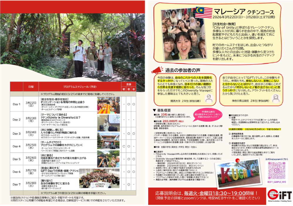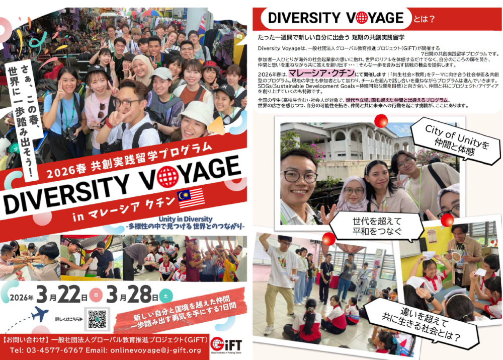 一般社団法人グローバル教育推進プロジェクト(GiFT)は、この春、全国の高校生・大学生・社会人を対象に「共創から、自分と世界の新しい可能性を見つける」プログラム、Diversity Voyageをマレーシアのクチンで実施します!