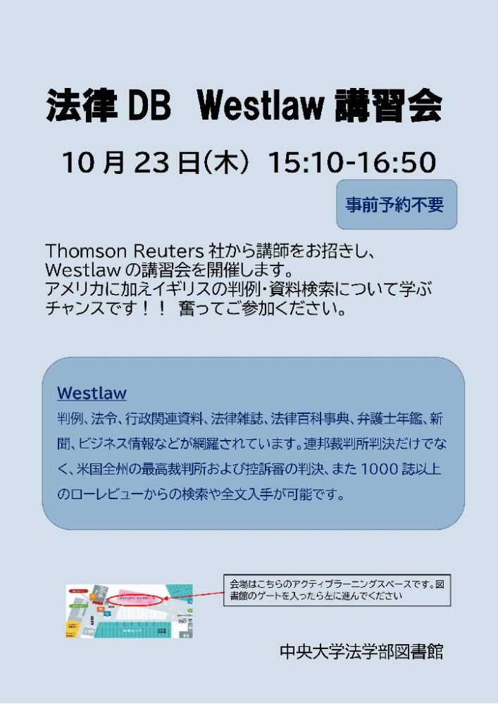 Thomson Reuters 社から講師をお招きし、Westlaw の講習会を開催します。 アメリカに加えイギリスの判例・資料検索について学ぶチャンスです!!