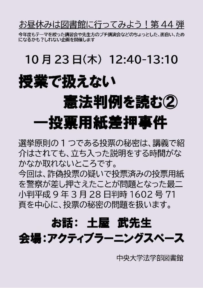 【法学部図書館】企画 お昼休みは図書館に行ってみよう!授業で扱えない憲法判例を読む②―投票用紙差押事件(10月23日)