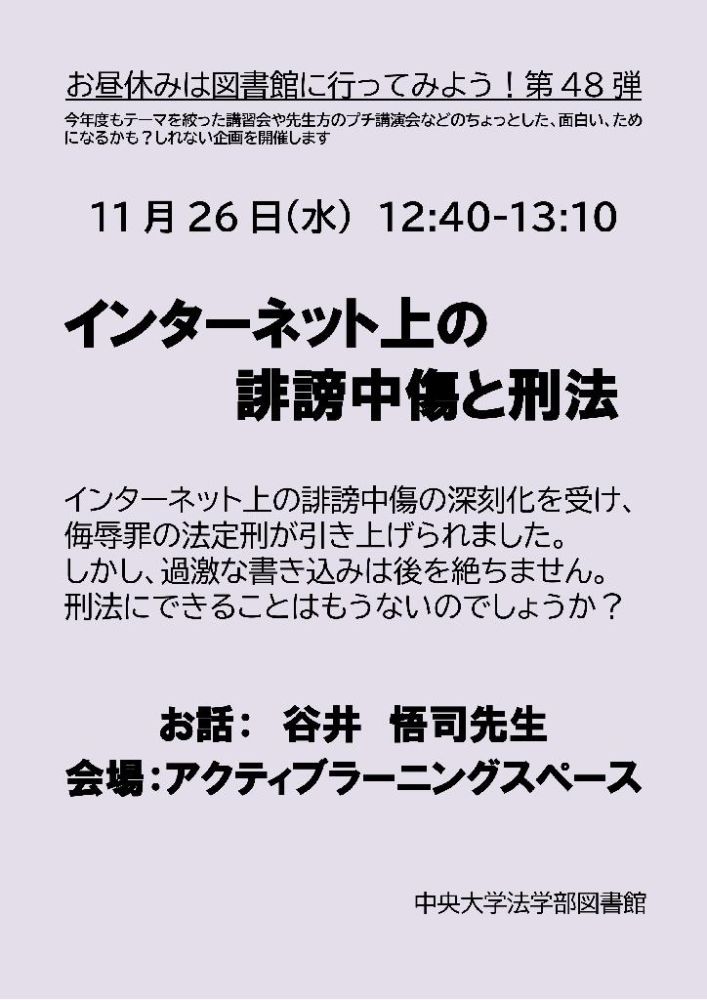 【法学部図書館】企画 お昼休みは図書館に行ってみよう!インターネット上の誹謗中傷と刑法(11月26日)